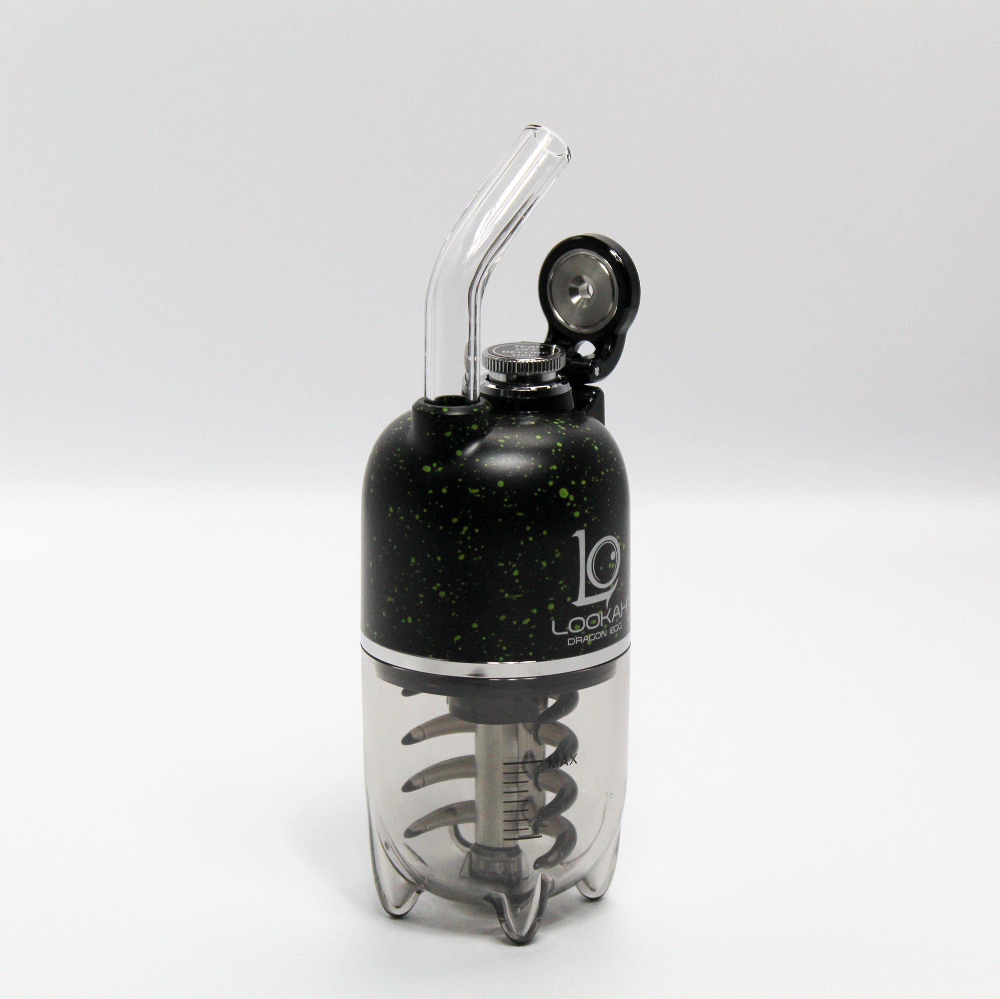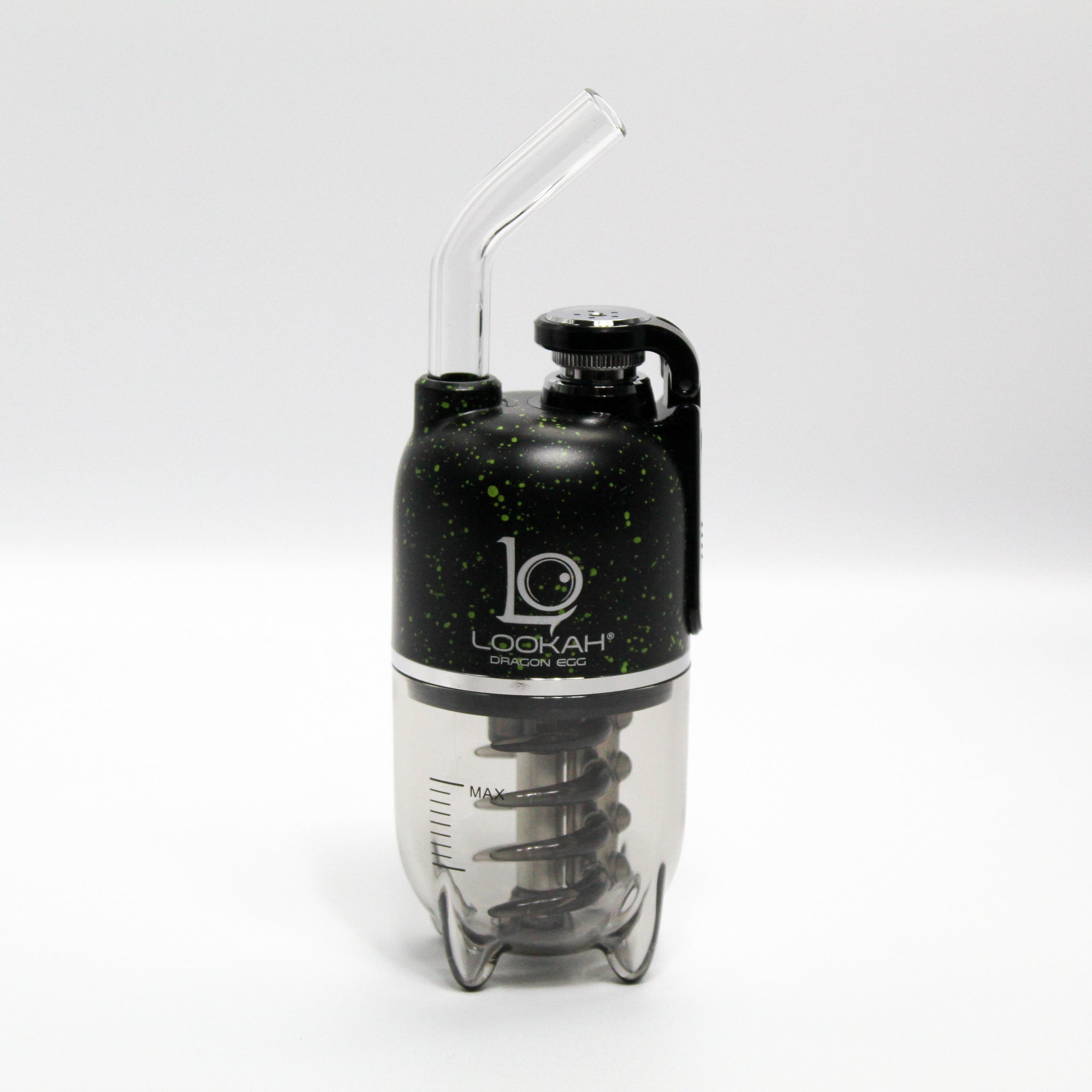Harness the fiery potential of a mythical beast with this cool, speckled Spatter Edition designs of the Lookah Dragon Egg E-Rig Bubbler! With its compact capsule shape, this electronic dab rig is always ready to go and easy to use. The magnetic atomizer interface keeps the atomizer chamber covered with no frustration, and it has a built-in carb hole for a bit of added circulation. This handheld dabbing device has an attached bubbler for cooling and filtering smoke through the intricately designed ribcage air guide. The glass mouthpiece has a straw shape that feels natural for sipping smoke. Users can view voltage modes and battery level on the digital display screen and can choose between three preset temperatures. The Dragon Egg E-Rig charges up quickly and easily with a USB-C charge cord (not included).