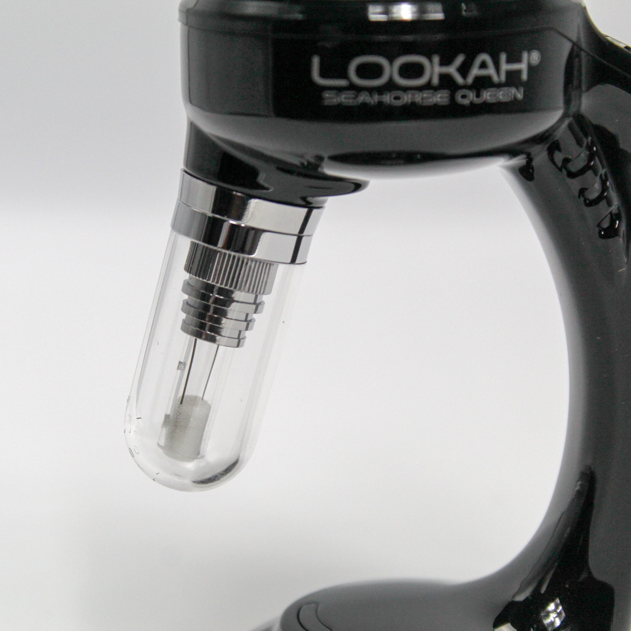 The top of the rig is a removable bubbler that helps to cool down hits before they reach the user. This attachment is easy to remove for cleaning the device using the included cleaning brush. The Seahorse Queen has a 510 threaded tip joint and works with all 510 threaded Lookah Seahorse dab tips.